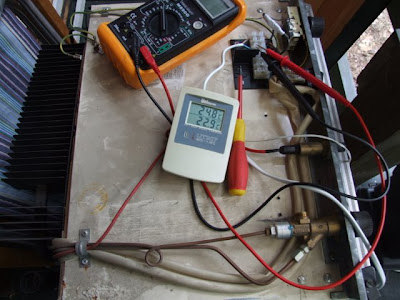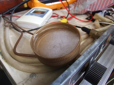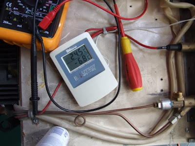 Jako że w poniedziałek mamy jechać na urlop, byłem zdeterminowany, by lodówkę naprawić. Ale nim to zrobiliśmy, trzeba było sprawdzić, czy rzeczywiście działa. Z pomocą dwupunktowego termometru pokojowego zobaczyliśmy efekt chłodzący przy pracy na gazie. Na prądzie 12V już nie.
