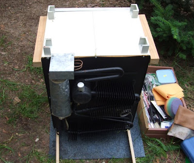 Przed ostatnim testem działania lodówki postanowiłem jeszcze nią wstrząsnąć. Wyczytałem bowiem gdzieś (na forum camperteam.pl zdaje się), że lodówki absorpcyjne mają przykrą tendencję do osłabiania wydajności gdy przez długi czas stoją nieruchomo. Coś tam w czynniku roboczym się dzieje (rozwarstwia się?), że przestają pracować tak, jak powinny. No to postawiliśmy lodówkę na głowie.