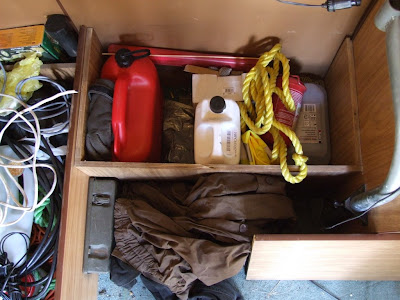 Wywaliliśmy wszystkie rzeczy wożone luzem, umyliśmy naczynia i kuchenkę ze zlewozmywakiem, zrobiliśmy porządek pod fotelami (odkryłem antyczną apteczkę samochodową, wyprodukowaną w 1985 roku, zawartość przełożyłem do kupionej niedawno wojskowej apteczki; odkryłem także drugi trójkąt ostrzegawczy), porobiłem fotki, i poskładałem wszystko z powrotem do samochodu. Tym razem w porządku.